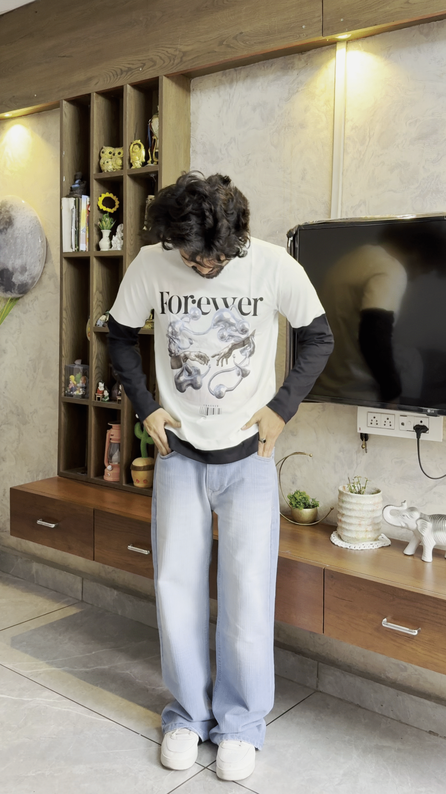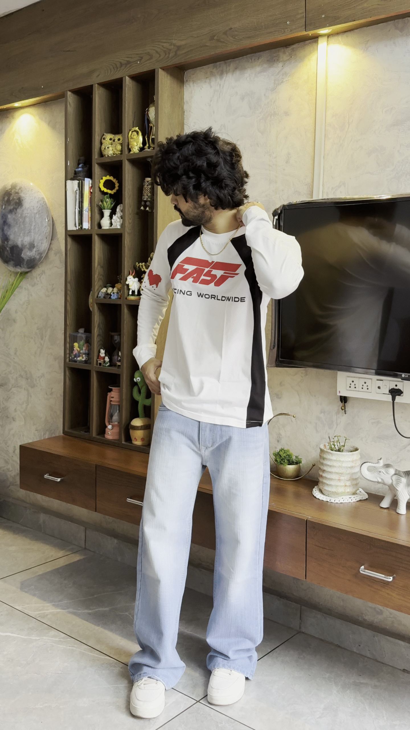 Β The shirt features a clean white base with bold black side panels, creating a sleek athletic silhouette that visually enhances body shape. The graphic design on the chest adds a dynamic streetwear vibe and makes the outfit stand out in a trendy way .