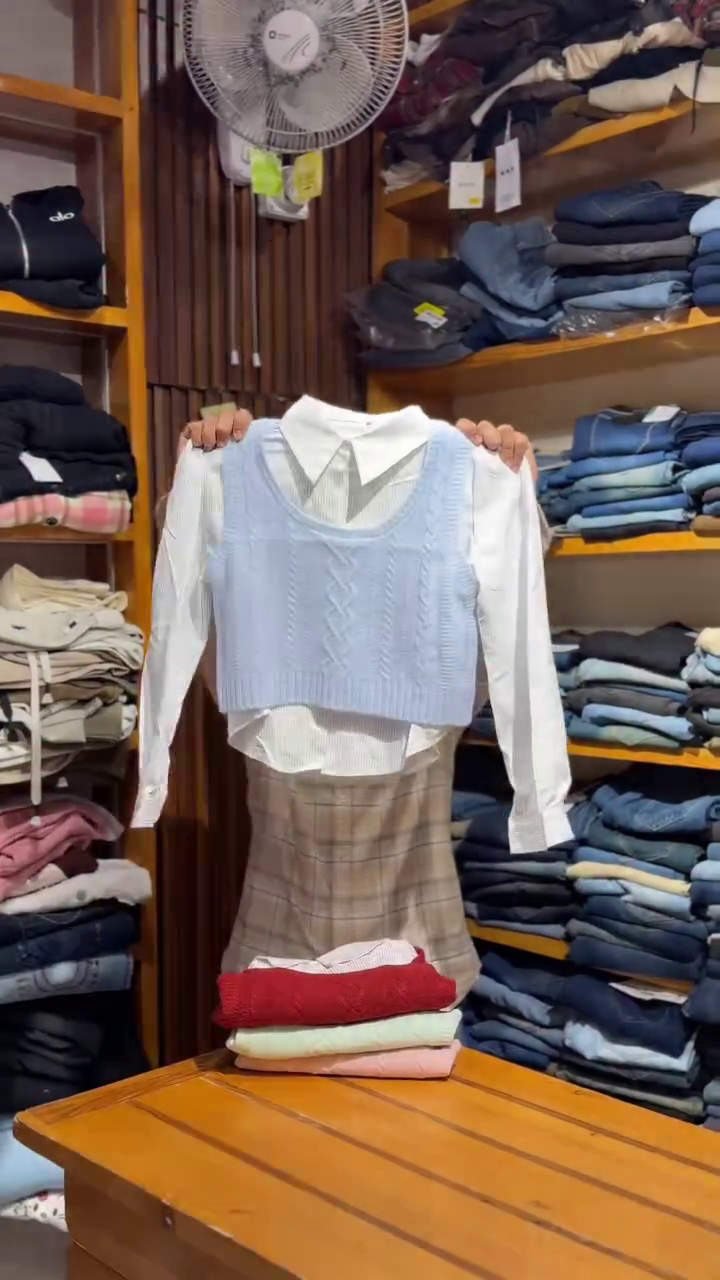 ​This cute academic‑inspired outfit features a sky‑blue cropped cable knit vest 💙 layered over a crisp white shirt 🤍 and paired with a neutral plaid skirt. The vest adds color and texture with its cable pattern and snug fit, while the shirt’s sharp collar and long sleeves keep the outfit looking clean and classic. The plaid skirt introduces a timeless school‑style vibe, perfect for college, café dates, or casual outings. This set looks great with loafers, ankle boots, or sneakers and can be styled with knee‑high socks or tights during colder days. Add a mini backpack or satchel to complete the study‑chic aesthetic. 📚✨