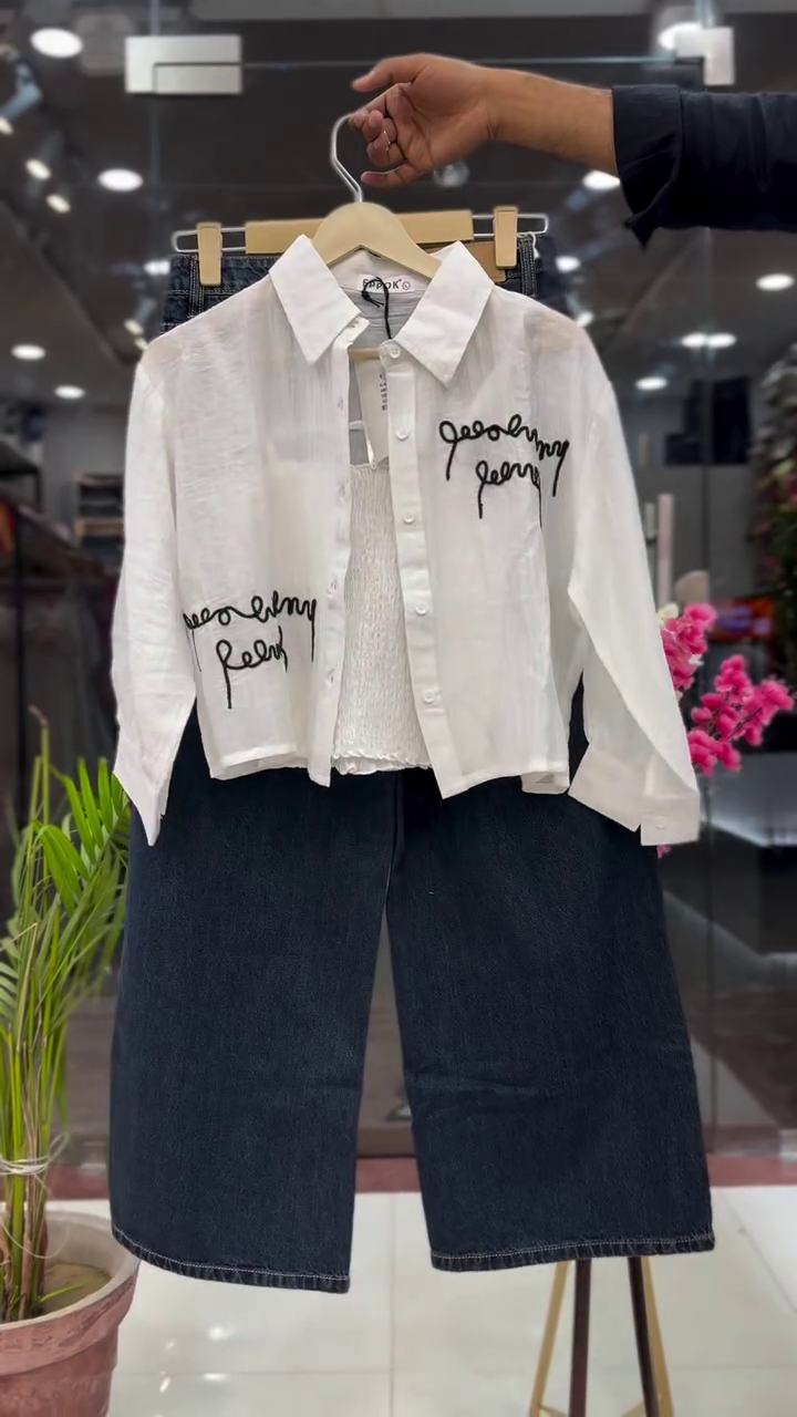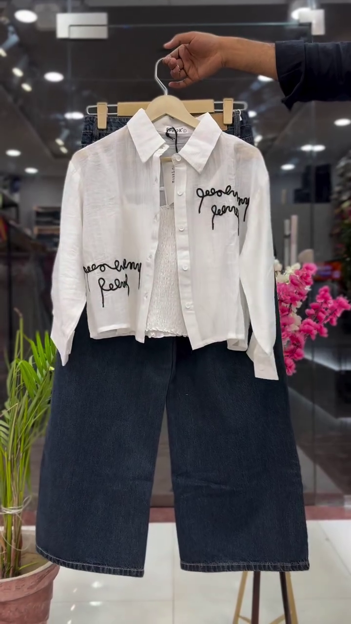 This chic western co-ord set ๐คโจ features a cropped white button-down shirt with a structured collar ๐ and elegant black script-style embroidery across the front and sleeves ๐๏ธ. The shirt includes full-length sleeves with buttoned cuffs and a clean front placket for a polished finish ๐. It is paired with high-waisted dark blue wide-leg denim culottes ๐ offering a relaxed yet trendy silhouette ๐. Crafted from breathable cotton-blend fabric ๐ฟ, this outfit is perfect for casual outings ๐๏ธ, college wear ๐, brunch dates โ, and smart-casual styling ๐. (Brand name removed as requested.)