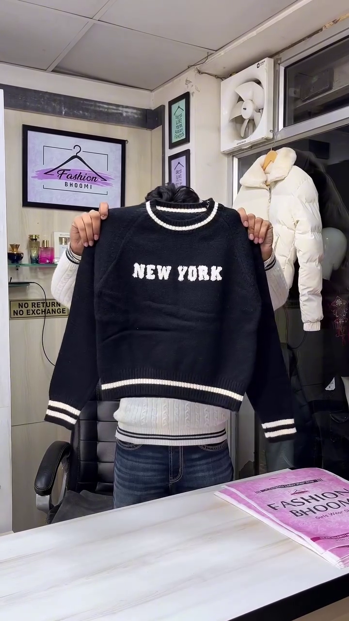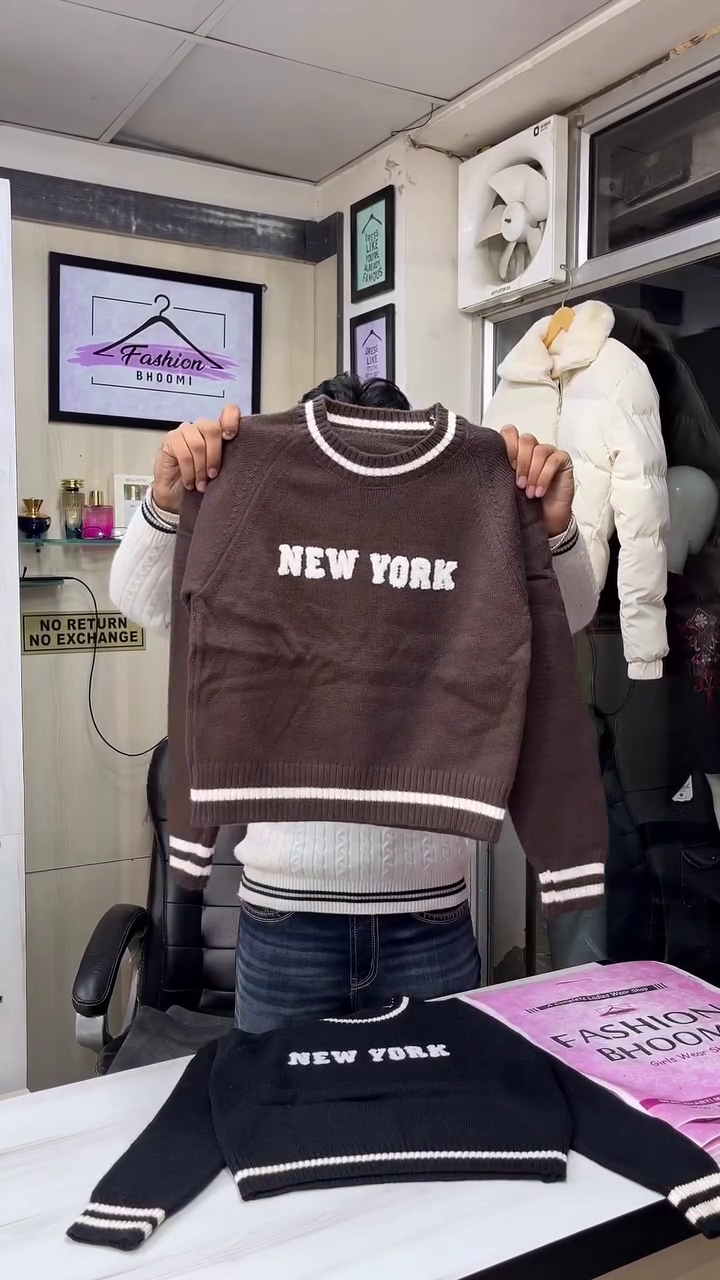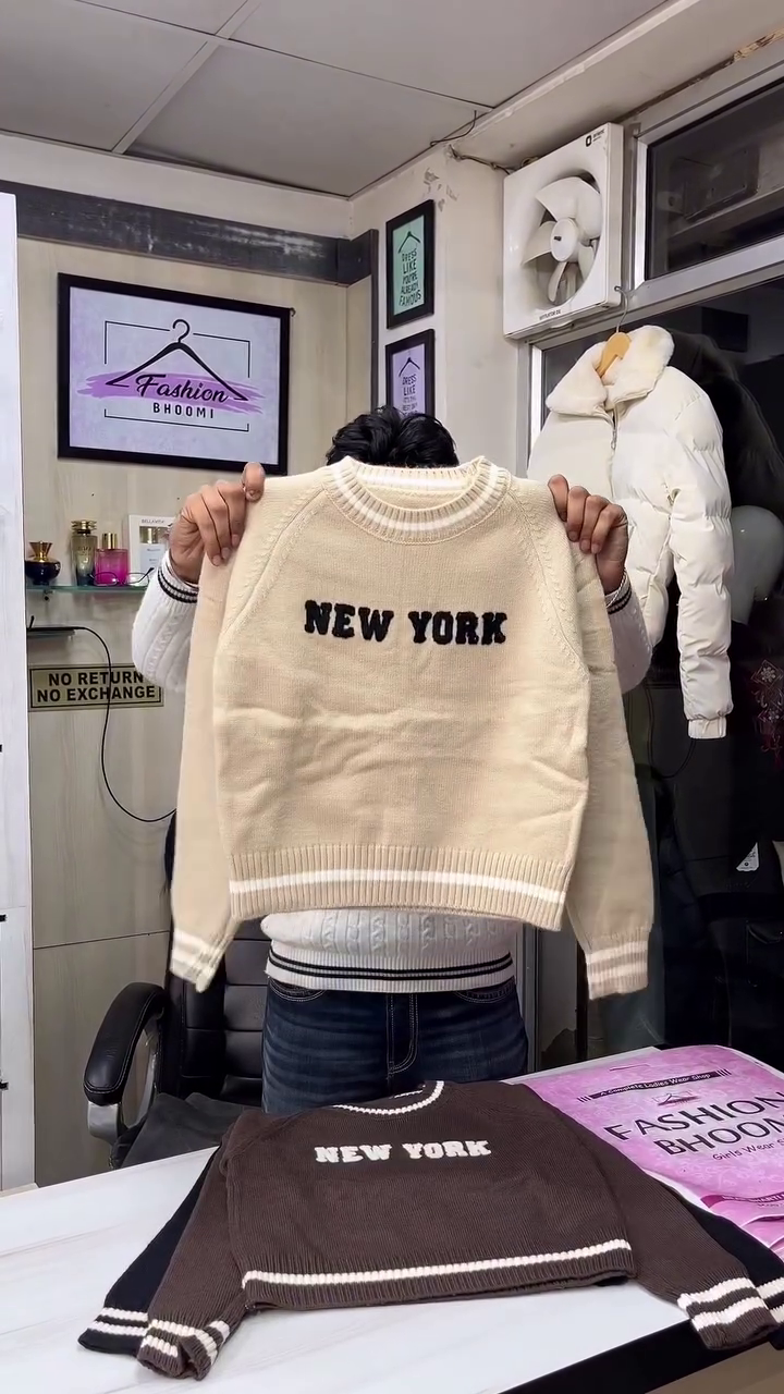 This cream knit sweater 🤍 is cozy, trendy, and perfect for everyday winter styling. Featuring a round neck with contrast black tipping, it gives a sporty yet casual vibe. The front showcases bold city‑inspired lettering in textured knit for a fun streetwear look 🖤. Sleeves and hem have matching striped rib cuffs that keep warmth in and give a snug fit. The soft knit fabric feels comfortable against the skin and is ideal for layering over shirts or under jackets. Pair it with jeans, joggers, or skirts for college, shopping days, and casual hangouts. It’s easy to style in multiple ways—tuck it slightly at the front for a relaxed, fashionable silhouette, or wear it loose for maximum comfort. Great for travel and daily winter wear. ❄️