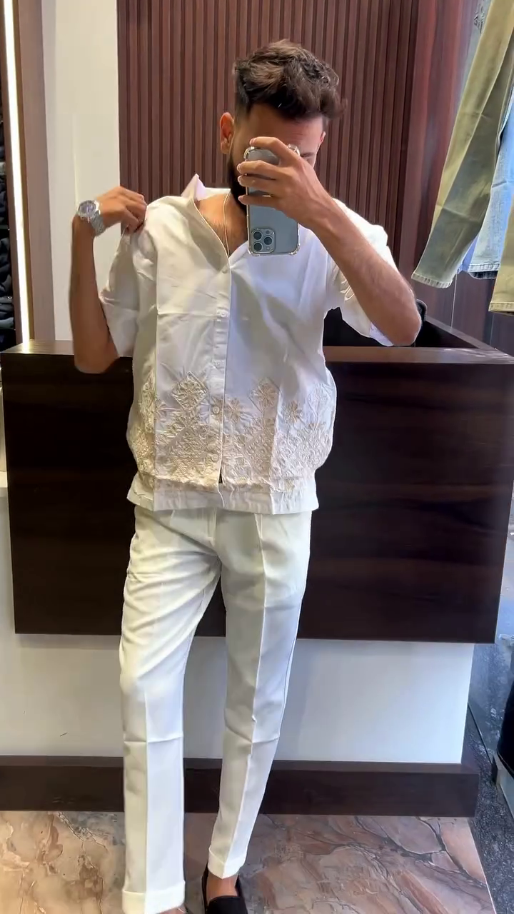 The embroidery placement at the lower panel gives the shirt a fusion look β modern from the top and ethnic-inspired at the base πΏ. The breathable lightweight fabric ensures day-long comfort βοΈ, while the straight hem and relaxed fit allow effortless styling with trousers, denim, or festive bottoms π.