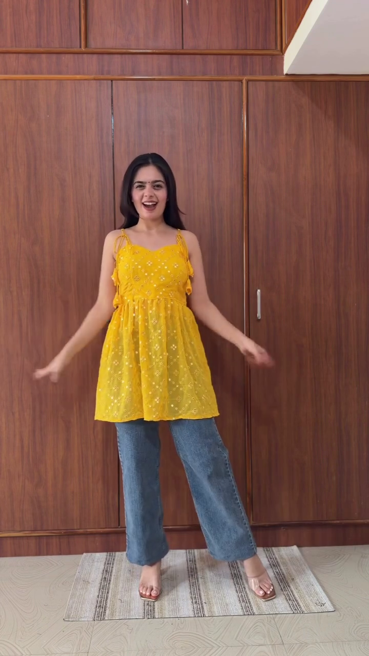 The delicate embroidery pattern adds handcrafted charm while the bright yellow tone radiates positivity and warmth. The comfortable loose lower portion allows free movement and all-day comfort.