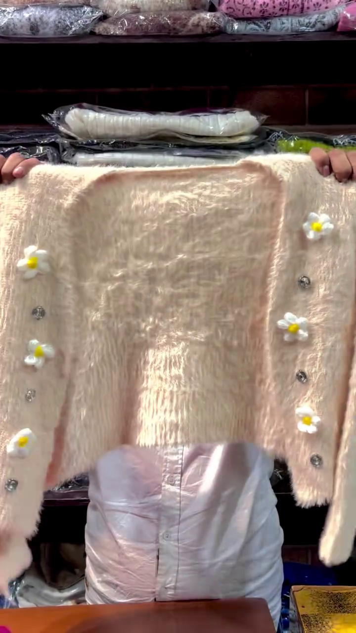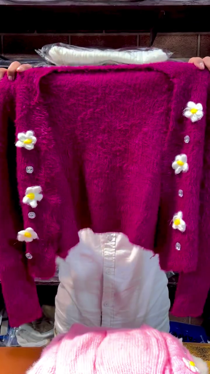 This fluffy pink cropped cardigan 🌸🩷 is a must‑have statement piece for cute winter layering. The fabric is soft, fuzzy, and comforting, wrapping you in warmth while giving a luxurious textured look. Down the front, sparkling decorative buttons add a touch of glam ✨, while 3D white and yellow daisy appliqués bring a fresh, playful detail that stands out. The cropped length pairs beautifully with high‑waist jeans, skirts, or dresses, making it perfect for brunch dates, parties, or everyday wear. Long sleeves keep you cozy, and the relaxed fit allows it to be layered over tees, tops, or dresses with ease. Wear it open like a shrug or buttoned for a snug feel. This cardigan is ideal for anyone who loves soft‑girl, pastel, or kawaii fashion styles 💖.