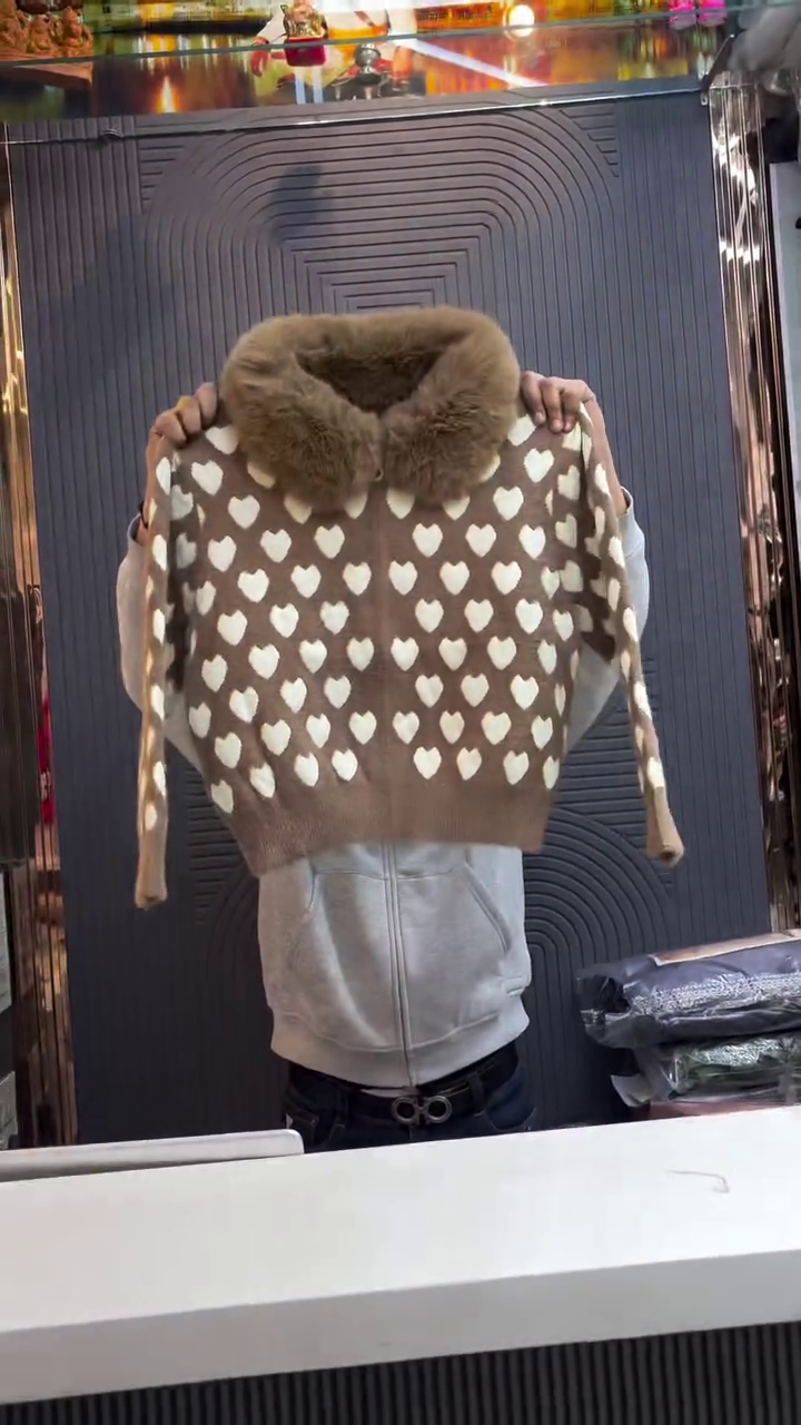 This adorable fluffy pink cardigan 🩷 is covered in soft white heart motifs 🤍, making it perfect for cozy, cute winter looks. The standout feature is the oversized faux fur collar that feels plush and warm around the neck, giving a luxe touch to the overall design. The cardigan has a front zipper for easy wear and temperature control, plus long sleeves and a relaxed fit that layers comfortably over tops or dresses. The hem sits at a flattering length around the waist, ideal for pairing with high‑waist jeans, skirts, or joggers. The fuzzy texture keeps you toasty on cold days while still looking stylish and playful. Great for coffee dates, outings with friends, or casual winter events. Style it with pastel accessories, boots, and a small handbag for a complete soft‑girl aesthetic. ✨