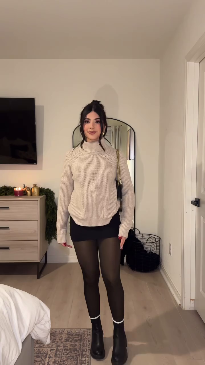 The Golden Hearth ensemble is a cozy ode to winter warmth and holiday sparkle ❄️✨. A beige turtleneck sweater wraps you in soft serenity 🧶, paired with a black mini skirt that adds a playful edge 🖤🎀. Sheer tights and frilled footwear complete the look with delicate drama 🧦👠. A gold-chain purse glints like firelight 🔗👜, while hoop earrings and styled hair elevate the vibe to festive finesse 💫💃🏽. Surrounded by candles, mirrors, and holiday décor 🎄🪞, this outfit is perfect for intimate gatherings or solo moments of joy. Available in ALL sizes—because every celebration deserves every silhouette 🌍💖.