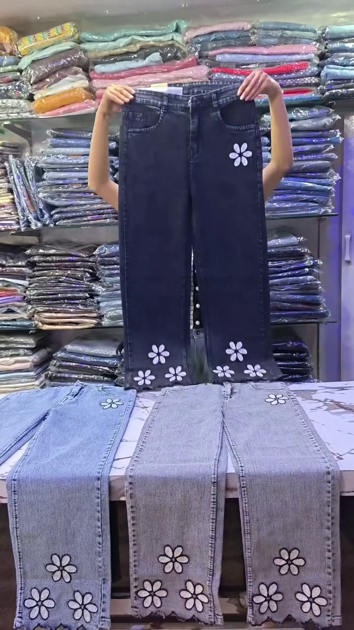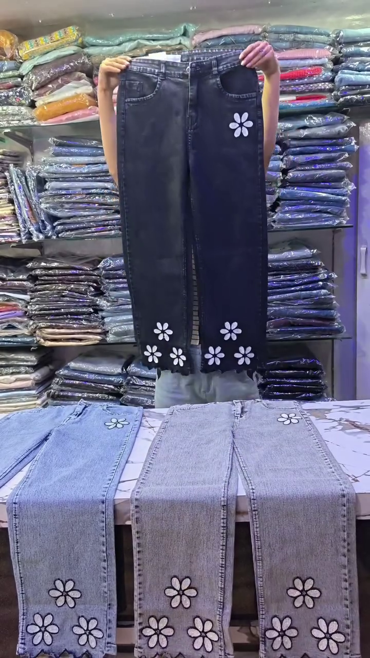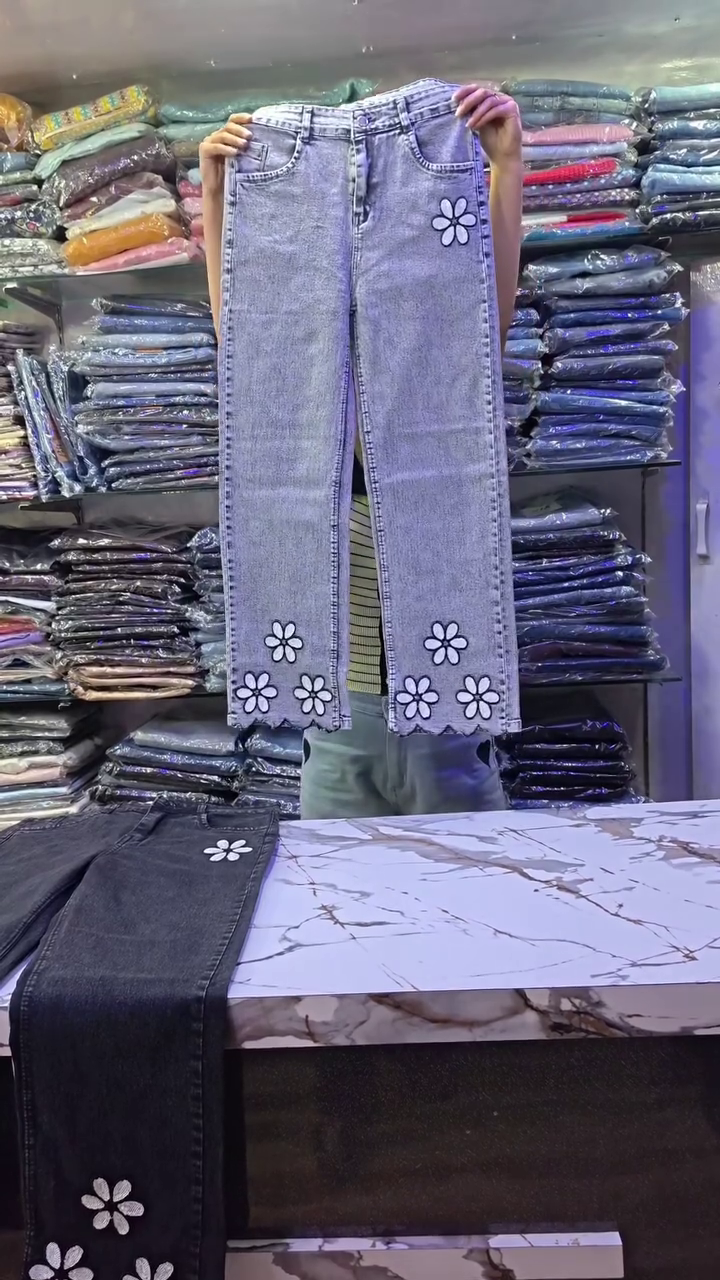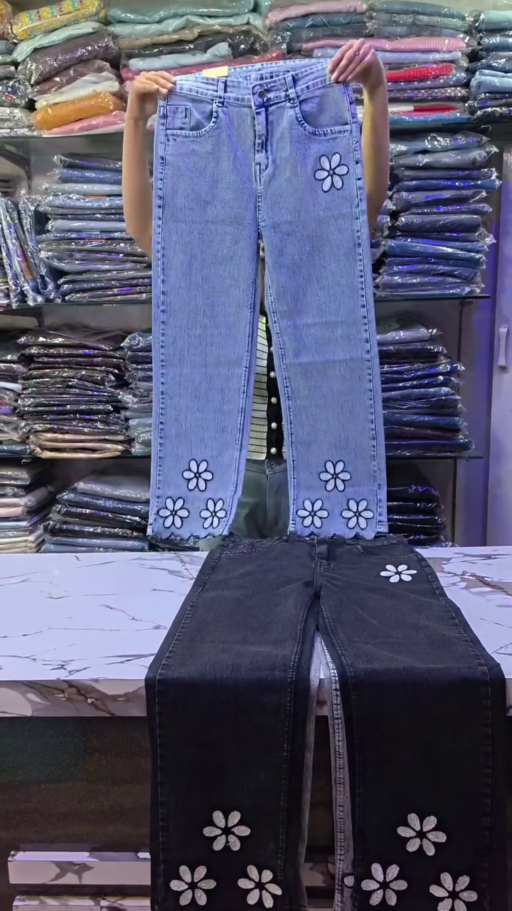 These trendy straight-fit jeans ๐ are designed with high-waist structure ๐ offering flattering shape and comfort. The light blue and deep black variants ๐ค feature cute daisy floral embroidery ๐ผ placed along the leg panels and near the hemline for a playful yet modern look ๐ธ.