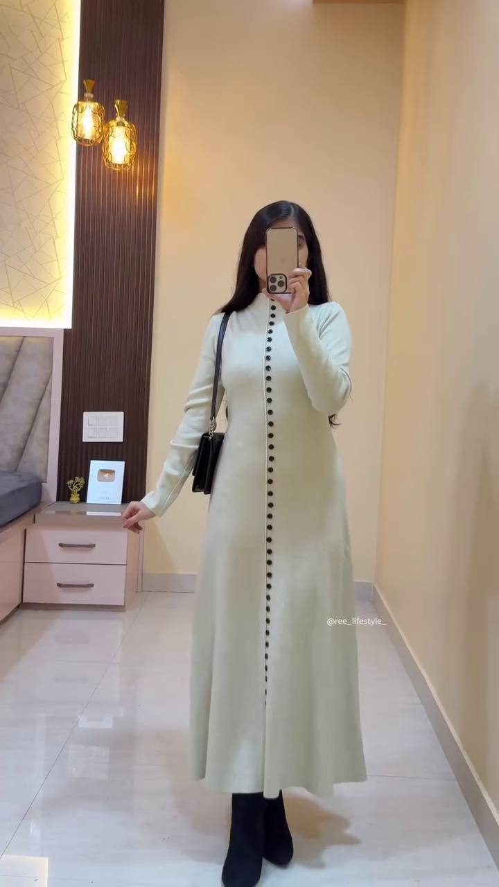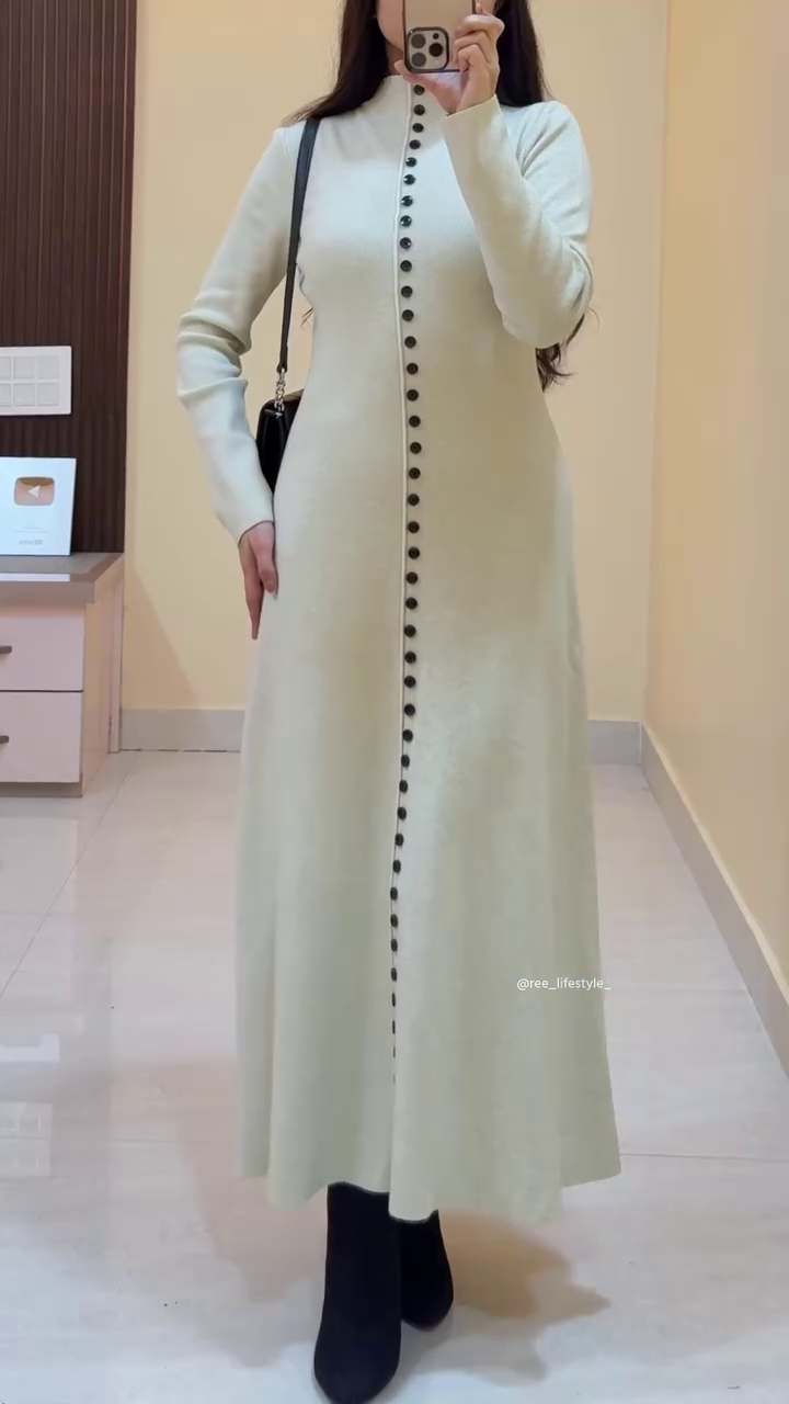 A timeless whisper of elegance, the Ivory Echo dress flows like a soft sonnet 🎶. With its high neckline and a poetic trail of black buttons running from collar to hem 🖤⬇️, this cream-hued beauty evokes vintage charm and modern modesty. Long sleeves wrap you in warmth 🌬️, while the gentle flare adds movement to every step 💃🏽. Paired with black accessories—a shoulder bag 👜 and sleek footwear 👢—this look is a study in contrast and confidence. Whether you’re attending a gallery opening 🎨 or sipping chai in solitude ☕, this piece speaks volumes in silence. Available in ALL sizes—because grace belongs to every silhouette 🌍💫.