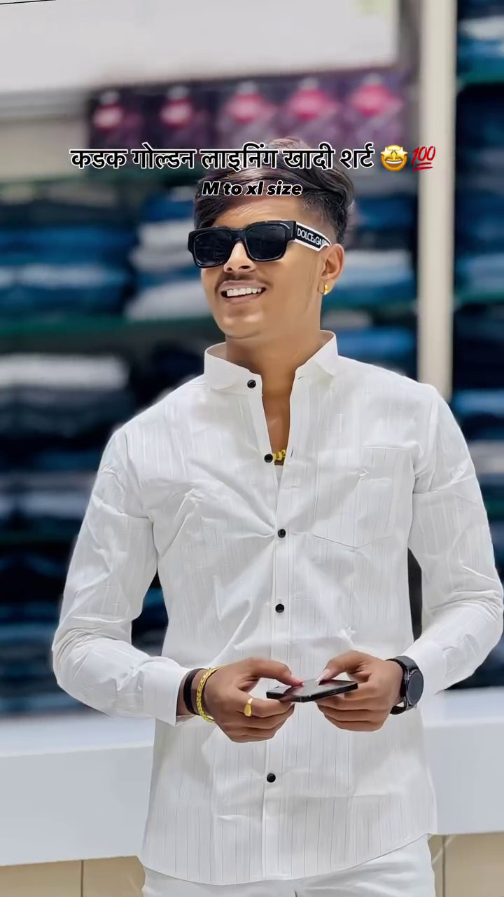 Elegance meets simplicity in this white khadi shirt with subtle golden lining and sleek black buttons 🌟👕. The texture whispers luxury, while the golden accents catch the light with every move 🌞🧵. Paired with bold accessories—sunglasses, bracelets, rings—this look is a masterclass in minimalism with personality 🕶️💍⌚.