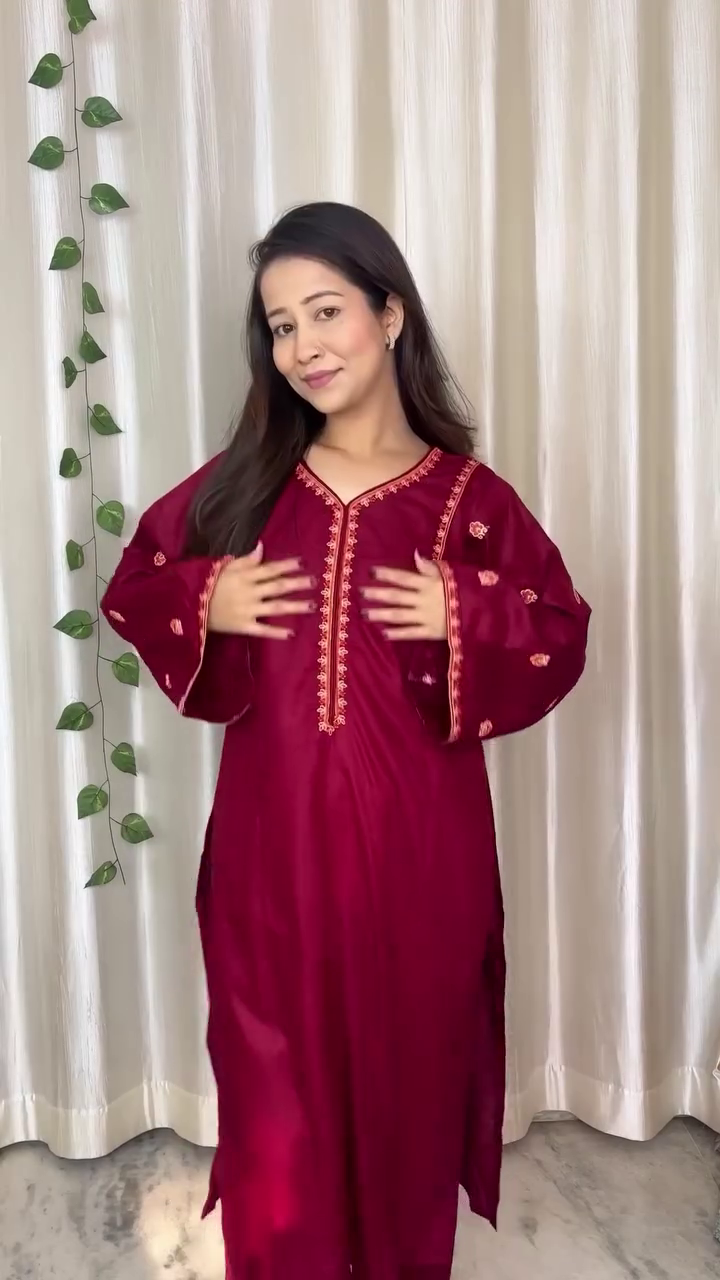 The three-quarter sleeve design and relaxed fit structure provide a balanced look that is both modest and stylish. The deep red color brings a bold yet sophisticated appearance that works well for daytime or evening wear.