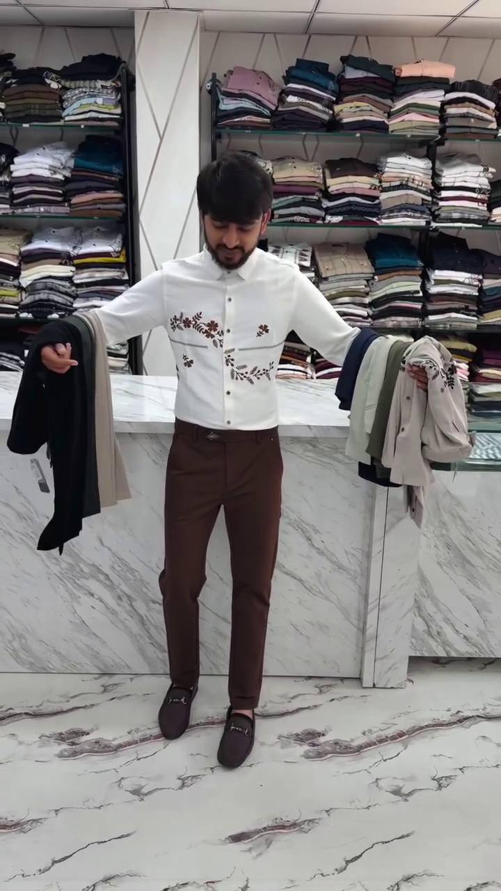Step into elegance with this navy blue shirt adorned with floral embroidery across the chest and sleeves 🌸πŸ§₯. The blossoms bloom in subtle threads, adding texture and romance to a structured silhouette. Paired with beige trousers and loafers, this look is refined yet expressiveβ€”perfect for gallery visits, date nights, or creative meetings πŸŽ¨πŸ•΄οΈ.