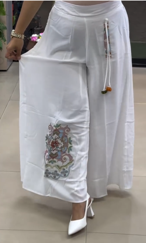 The highlight of these palazzos is the beautiful multicolor embroidery at the bottom, featuring intricate floral and traditional motifs that add a touch of ethnic charm. A subtle vertical embroidered detail on the front further enhances the uniqueness of the design, giving it a modern fusion appeal.