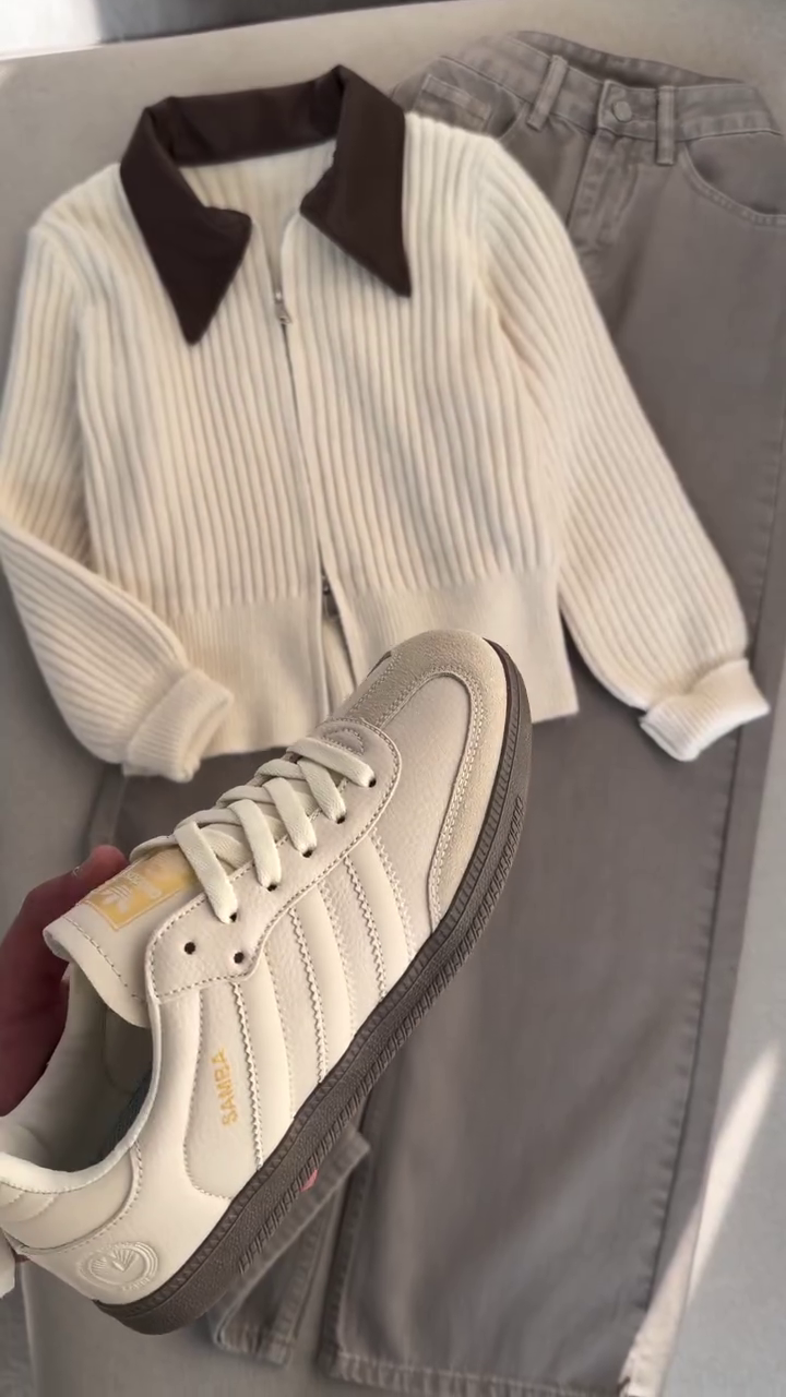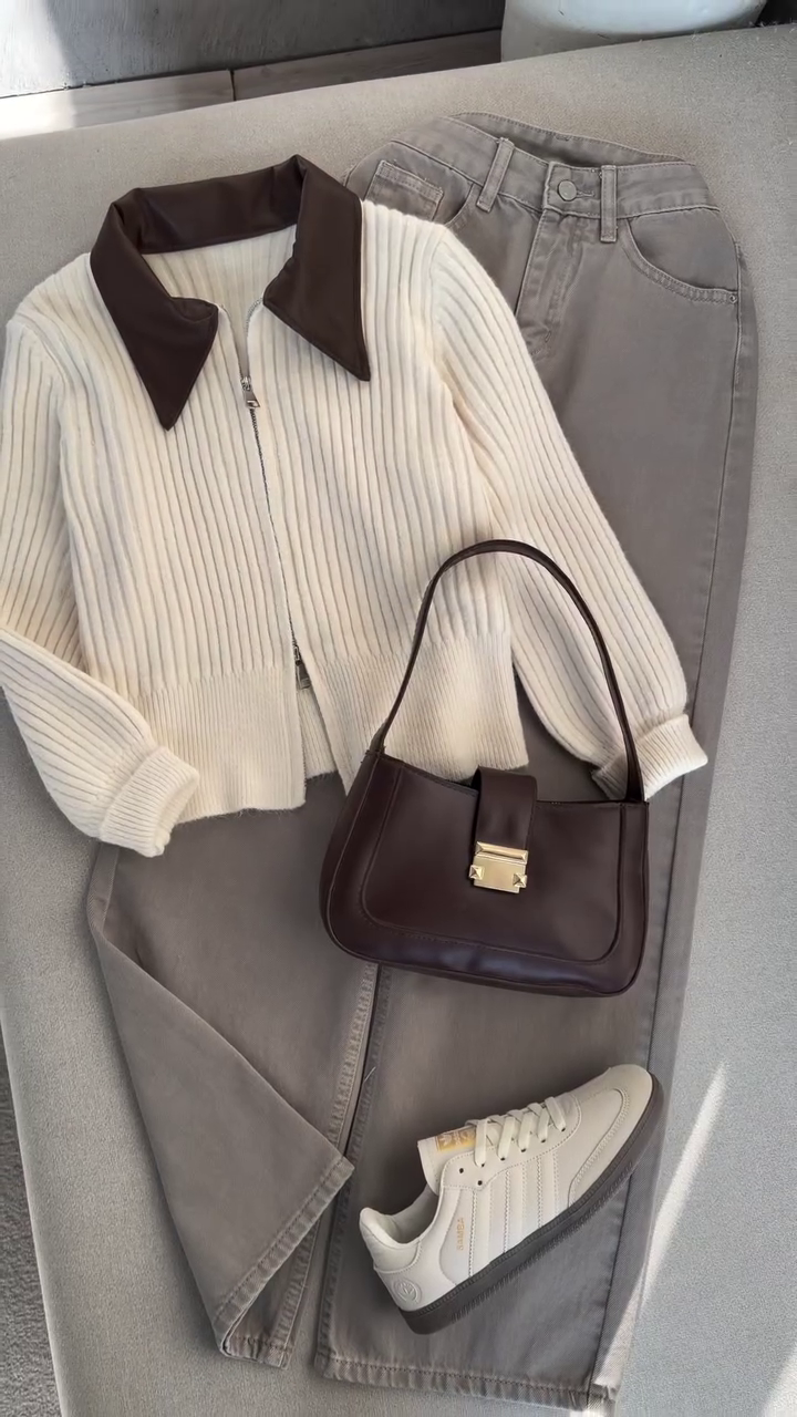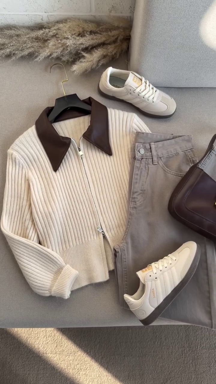 This laid-out ensemble is a cozy dream in neutral tones 🌾🧢. The cream ribbed zip-up sweater with a rich brown collar pairs effortlessly with light gray pants and white sneakers with gold accents πŸ‘Ÿβœ¨. A dark brown handbag adds elegance, while the pampas grass and brick wall backdrop evoke calm and curated charm 🌿🧱.