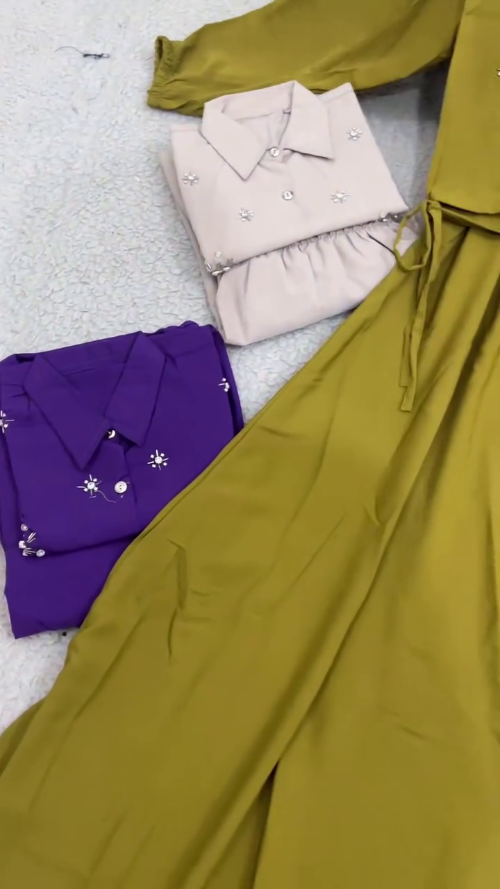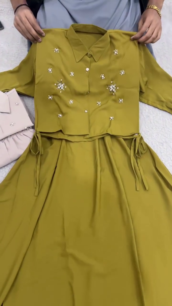 πβ¨ A graceful two-piece set featuring a collared cropped shirt adorned with delicate floral stone embellishments πΈπ across the front. The shirt includes front buttons π and side tie details π for adjustable styling.