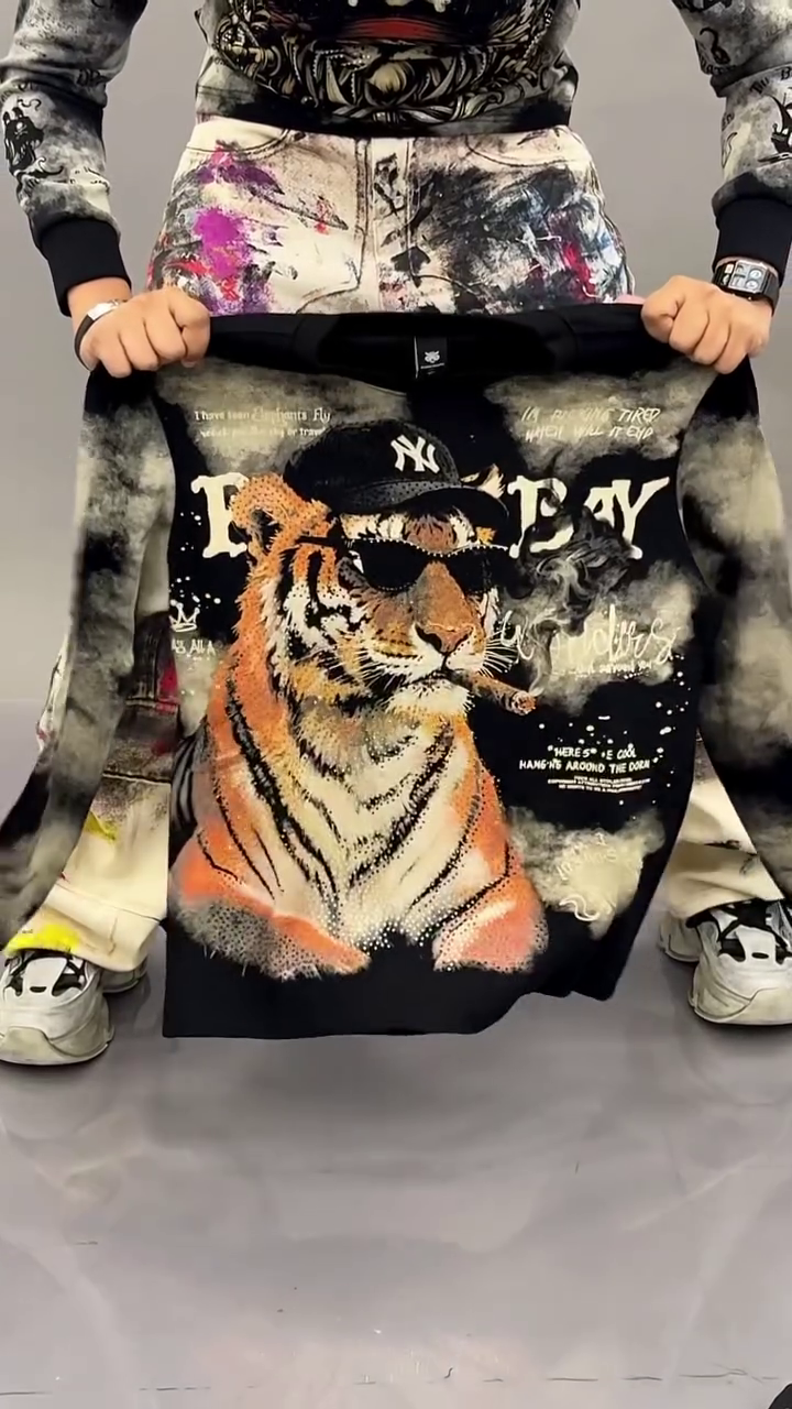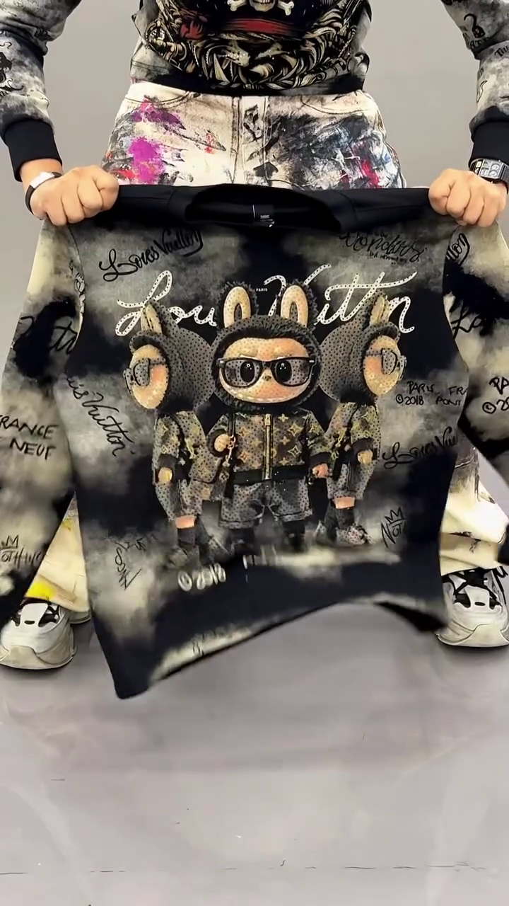 This bold black oversized sweatshirt πŸ–€ features a statement front graphic illustration 🎭 of three stylized cartoon characters in streetwear fashion 😎. The artistic washed smoke-effect background 🌫️ adds a trendy edgy vibe perfect for modern fashion lovers πŸ’₯.