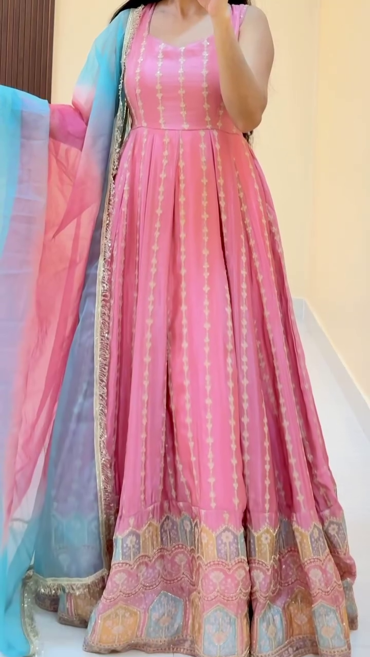 Step into a world of soft elegance with this breathtaking Pastel Dream Weave Flared Anarkali Set in shades of baby pink and sky blue ๐ŸŒธ๐Ÿ’—๐Ÿ’™. The beautifully crafted Anarkali features delicate vertical woven patterns that elongate the silhouette and add a graceful shimmer with every movement โœจ๐ŸŒŸ.