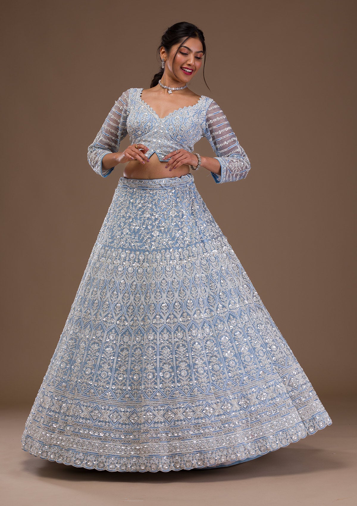Product Category: LehengaFabric: NetWork: PearlworkSecondary Work:Top Style: BlouseNeckline: Leaf NecklineSleeve Type: SleevelessDupatta Fabric: GeorgetteBottom Style: SkirtBottom Work: Threadwork