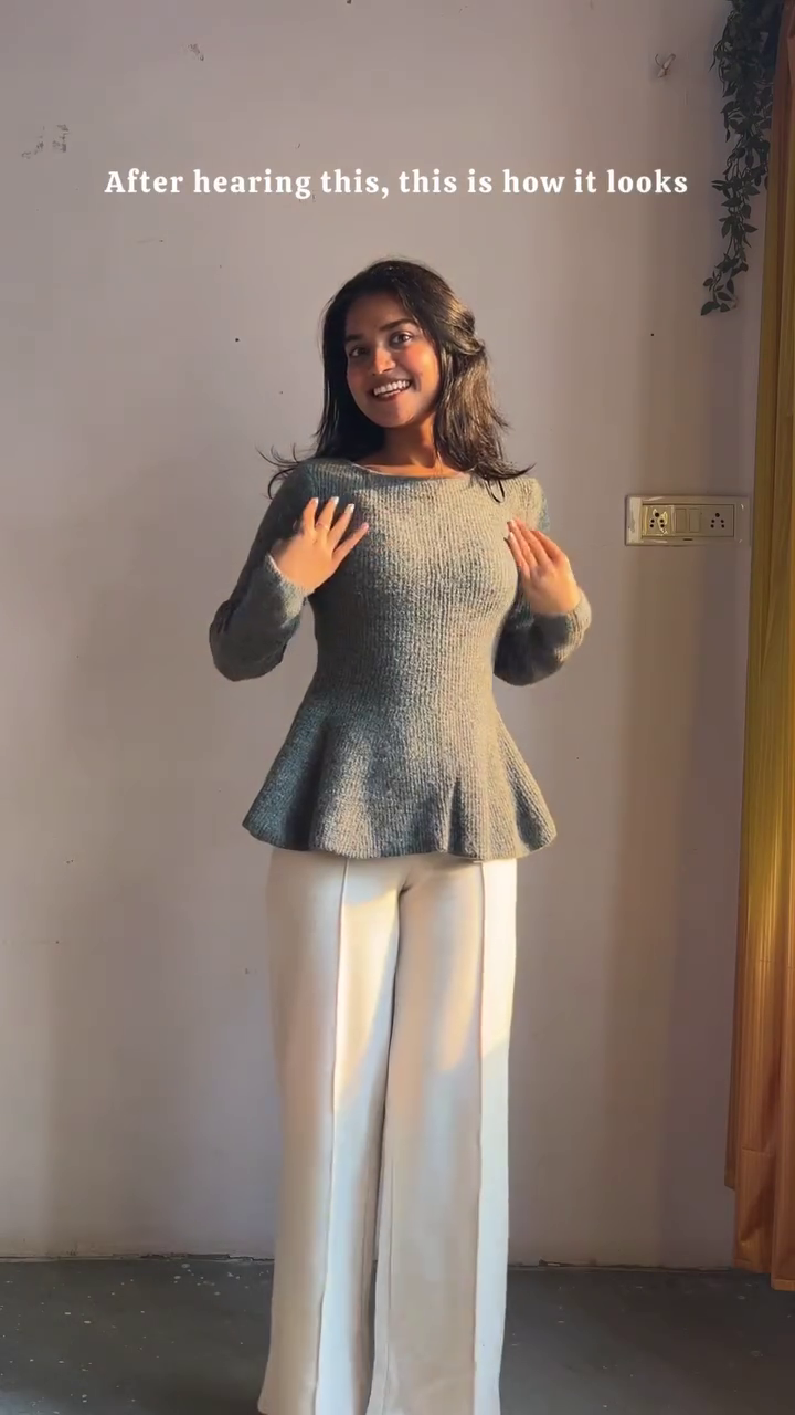 Paired with wide-leg ivory trousers 🤍👖, the look becomes a dance of contrast—soft neutrals meeting structured lines, fluidity meeting form. The trousers sway with every step 💃🏽🌬️, creating a silhouette that feels both grounded and ethereal. Standing on woven textures 🧺🌿 and bathed in natural sunlight ☀️✨, this outfit radiates effortless modernity.