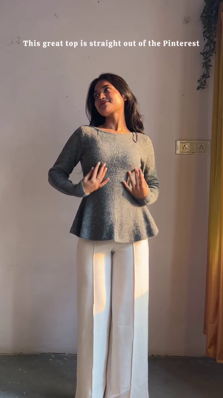 Accessories remain minimal yet intentional: a smartphone in hand 📱, a curtain draped with greenery 🌿, and sunlight casting golden shadows across the scene 🌞🪟. It’s a look made for quiet mornings, creative afternoons, and reflective evenings—whether you’re sketching ideas in a studio 🎨, sipping coffee in a sunlit corner ☕🌼, or capturing a mirror moment 📸🪞.