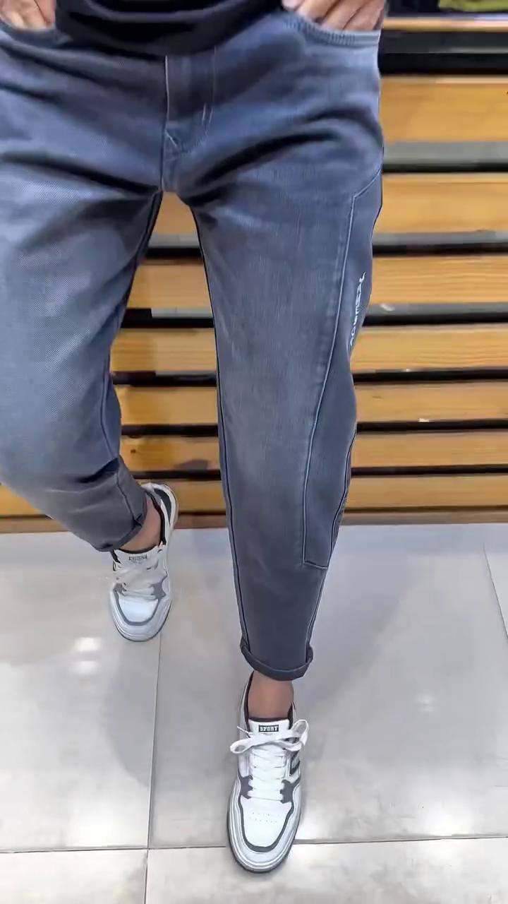 These dark gray denim jeans are stitched for strength and styled for movement πŸ§΅πŸ›Ή. Featuring angular side pockets and a woven black-and-white belt, they offer both utility and edge. The vertical embroidery has been removed to keep the look clean and versatile πŸ§ΌπŸ–€.