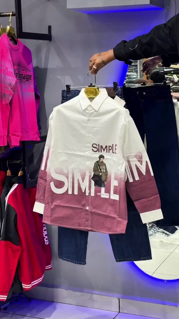 The button-down shirt features a unique color block design, blending white and dusty rose tones with large bold text graphics across the fabric. The visual design gives the shirt a trendy streetwear aesthetic.