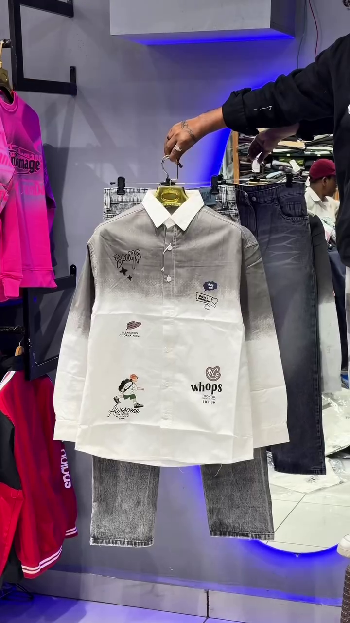 This modern two-piece western casual outfit set combines a stylish graphic printed shirt with classic denim jeans for a relaxed contemporary look.