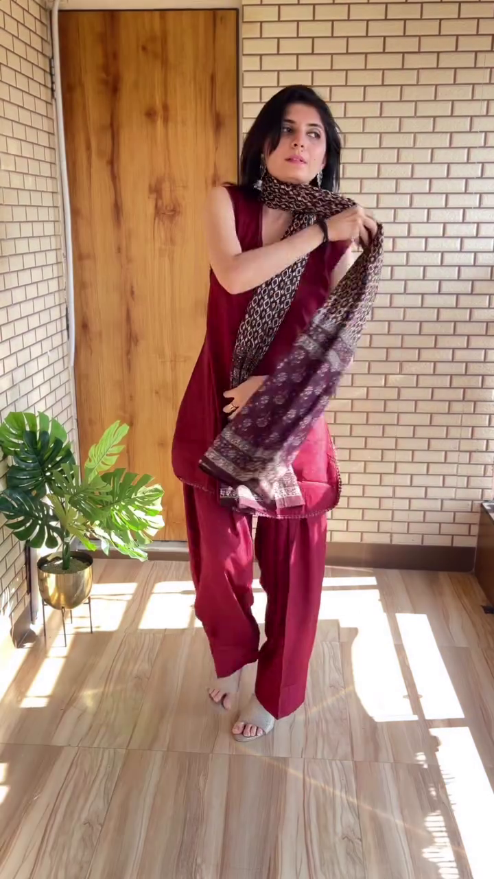 This elegant three-piece ethnic fusion outfit features a minimal ivory sleeveless kurta, comfortable matching straight pants, and a contrasting indigo printed dupatta that adds traditional character to the look.