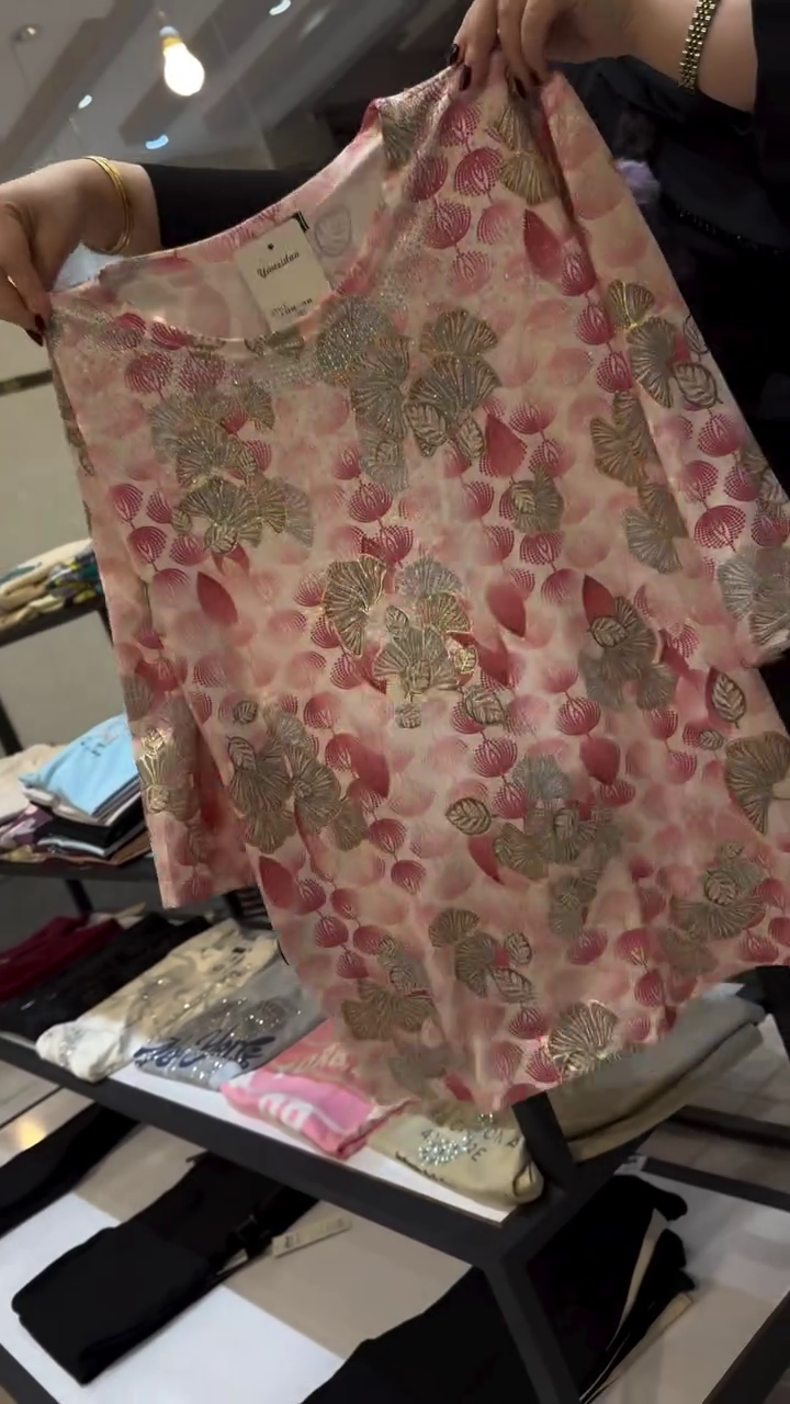 This blush pink festive kurta-style top πΈ features intricate gold metallic leaf embroidery π with soft shimmering detailing for a luxurious glow β¨. The semi-sheer lightweight fabric adds elegance while maintaining comfort βοΈ.