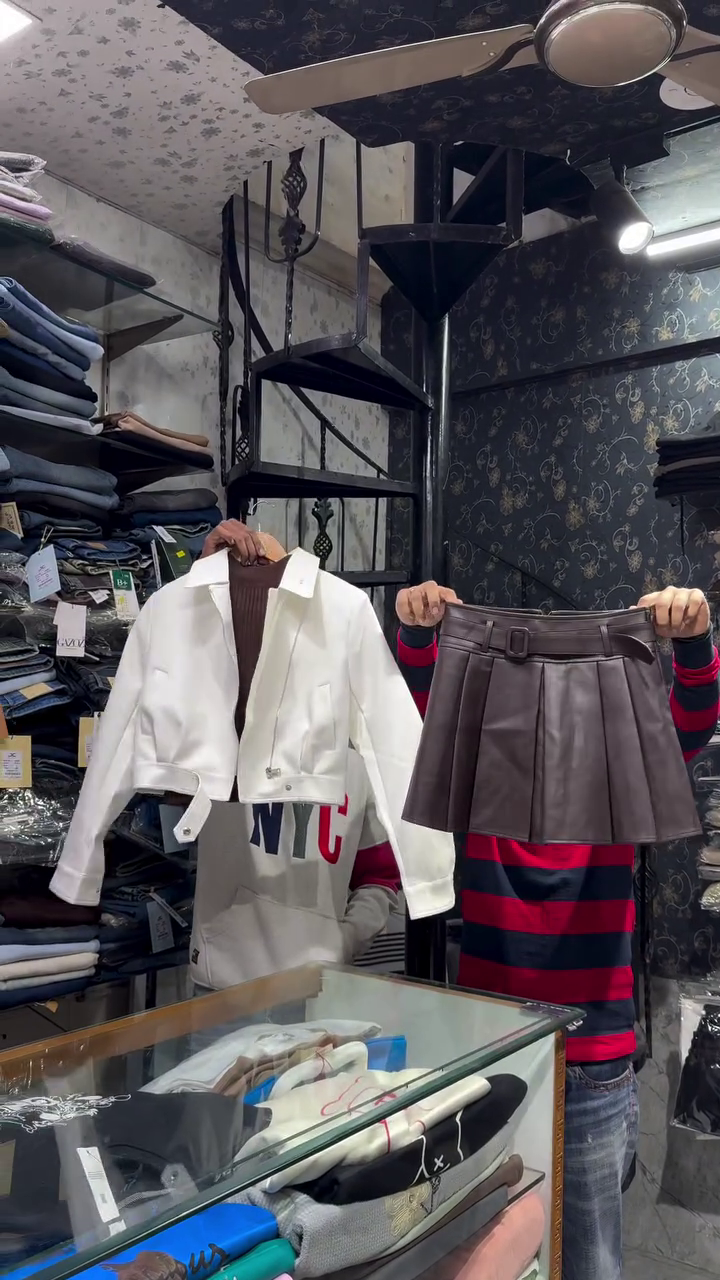 This trendy two‑piece outfit set combines a sharp white cropped jacket 🤍 with a rich brown pleated faux leather mini skirt 🤎 for a fashionable, city‑chic look. The jacket has a tailored fit, long sleeves, and a clean front with subtle detailing, making it perfect for layering over tops or knit inners. Underneath, a high‑neck ribbed knit top in a matching brown tone adds warmth and texture. The mini skirt features structured pleats and a belt at the waist, highlighting your silhouette and giving a playful, youthful vibe. This set is ideal for parties, day outings, or date nights, especially in cooler weather when paired with stockings and boots. Add a small shoulder bag and simple jewelry to finish the look. ✨