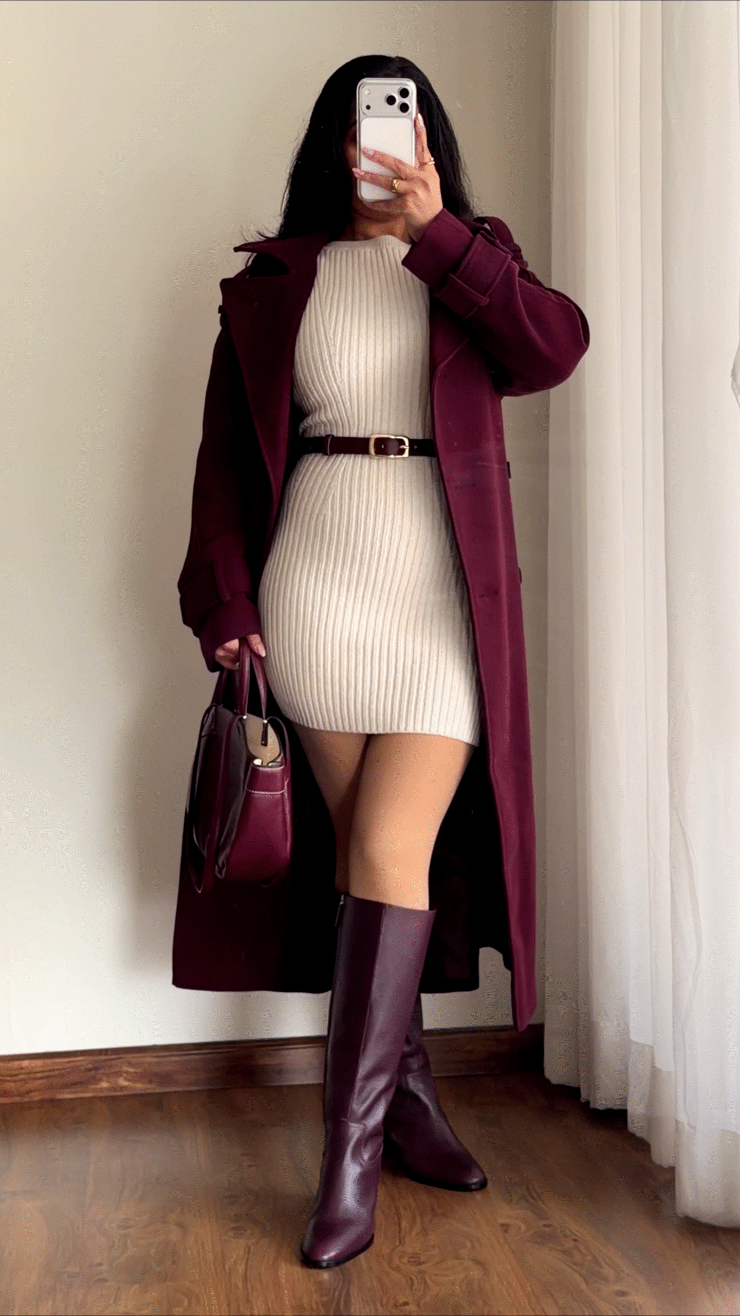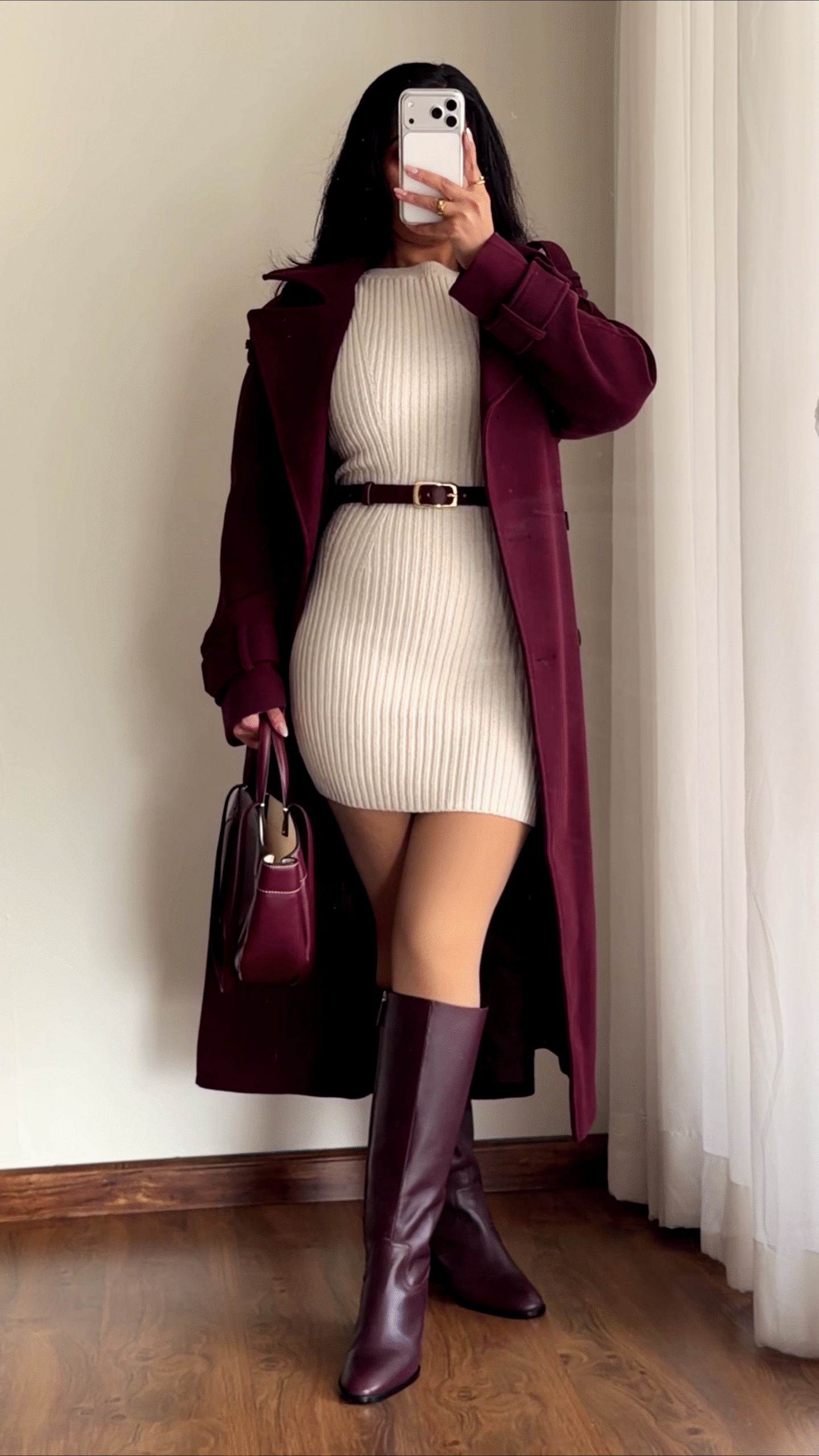 Elevate your winter style with this elegant maroon longline coat paired with a ribbed knit bodycon dress! 🍷 The coat features a tailored silhouette with a structured collar, refined lapels, and statement belted cuffs for modern flair. The knit dress hugs your curves, providing warmth and comfort, while adding a subtle textural contrast. 🤎 The included slim leather belt cinches the waist, enhancing your figure and providing a polished finish. Whether you’re headed to the office or enjoying a festive dinner, this duo can be styled with matching boots, a chic handbag, and dainty gold jewelry for a complete, high-fashion ensemble. Ideal for cooler climates and every stylish wardrobe! 🔥 Available in: XS, S, M, L, XL, XXL.👠
